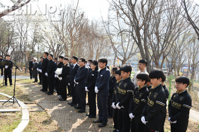 천안초등학교는 이날 교내 추모비 앞에서 윤경란 교장을 비롯한 교직원과 축구부 학생, 생존 졸업생, 체육계 관계자 등이 참석한 가운데 희생자들을 기리는 시간을 가졌다.