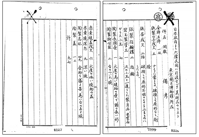 이상과 같은 지침을 바탕으로 한국 측은 제1차 실무위원회(1월 7일)와 제2차 실무위원회(1월 14일)에서 일본 측에 반환 가능한 문화재 목록 제출을 요청했다. 일본 측은 제4차 실무위원회(1월 27일)에서 97점의 목록을 제출했는데, 이는 당시 도쿄국립박물관이 소장하고 있었던 창녕군 교동 31호 고분 출토품이었다. 이 유물은 발굴 이후 조선총독부 박물관에 보관되다가 1938년 9월 5일에 도쿄국립박물관의 전신에 해당하는 제실박물관(帝室博物館)에 기증된 경위가 있었다. 그리고 제2차 한일회담 당시 한국 측이 제출했던 '일본 소재 한국 국보 미술공예품 목록'(칼럼 제1부 ② 참조) 중 도쿄국립박물관이 소장하고 있던 유물에 해당하는 것이었다.