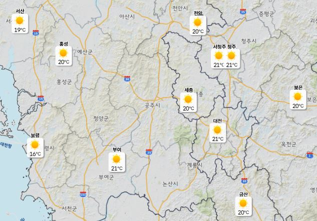 이날 낮 최고기온은 대전 19도, 세종·천안 20도, 청주 21도로 예보됐으며 아침 최저기온은 4도 안팎에 머물 것으로 보인다.