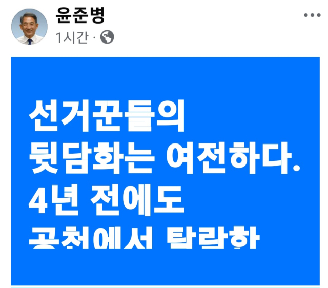윤 위원장은 이어 "2026년 지방선거에서도 자신의 허물로 탈락한 후보들과 그 캠프들은 변함없이 돈을 거론하며 다음 총선에 보잔다"며 "본인들만 애써 외면하지만 왜 공천에서 탈락했는지를 시민들은 다 안다"고 짤막하지만 함의적인 글을 올렸다.