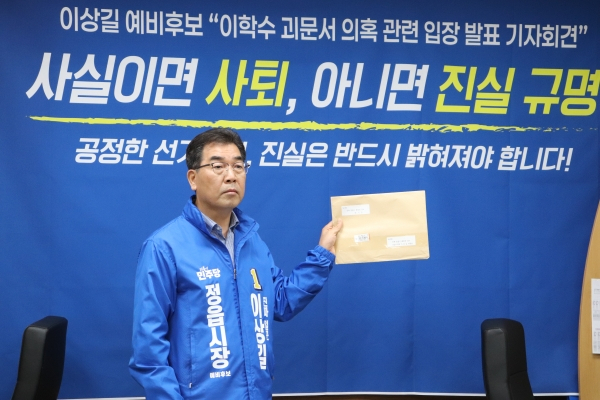 전북 정읍시장 선거를 앞두고 현 시장에 대한 '괴문서' 논란이 일고 있는 가운데, 이상길 더불어민주당 예비후보가 관련 의혹을 전면 부인하며 수사기관의 신속한 진상 규명을 촉구했다.