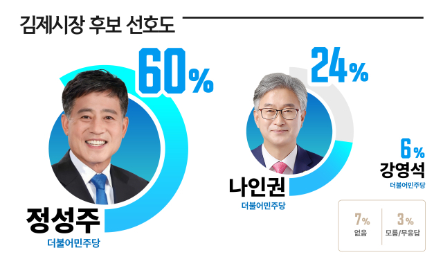 전북 김제시장 출마 예상 후보들을 대상으로 하는 선호도 여론조사에서 정성주 현 김제시장이 60%로 가장 높았다.