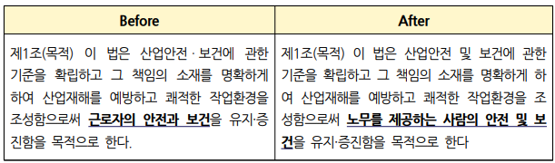 "에이, 설마 그러겠어? 정부를 너무 못 믿는 거 아니야?" 실제 사례를 들어보자. 산업안전보건법(산안법) 전부개정이 이뤄진 2020년, 특수고용·플랫폼 중 일부 업종도 산안법 보호범위에 포함되기 시작했다. 전부개정 당시 법의 제1조 '목적' 조항이 바뀐 것이다.(아래 표)