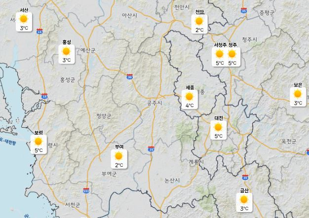 이날 낮 최고기온은 대전·청주 19도, 세종·천안 18도로 예보됐으며 아침 최저기온은 2도까지 내려가며 낮과 밤의 기온차가 크게 나타날 예정이다.