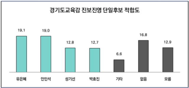 <프레시안>이 여론조사 업체 시그널앤펄스에 의뢰해 지난 2일~3일 경기도 거주 만18세 이상 성인 남녀 1001명을 상대로 여론조사를 실시한 결과, 진보 진영의 경기교육감 단일후보로 적합한 인물은 유은혜 전 부총리가 19.1%, 안민석 전 의원이 19.0%, 성기선 전 한국교육과정평가원장이 12.8%, 박효진 전 전교조 경기지부장이 12.7%로 나타났다. '적합인물 없음'은 16.8%, '모름'은 12.9%였다.