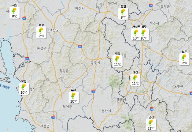 이날 낮 최고기온은 대전·세종·청주·천안 모두 15도 안팎에 머물고 아침 최저기온은 10도 내외로 예보됐다.