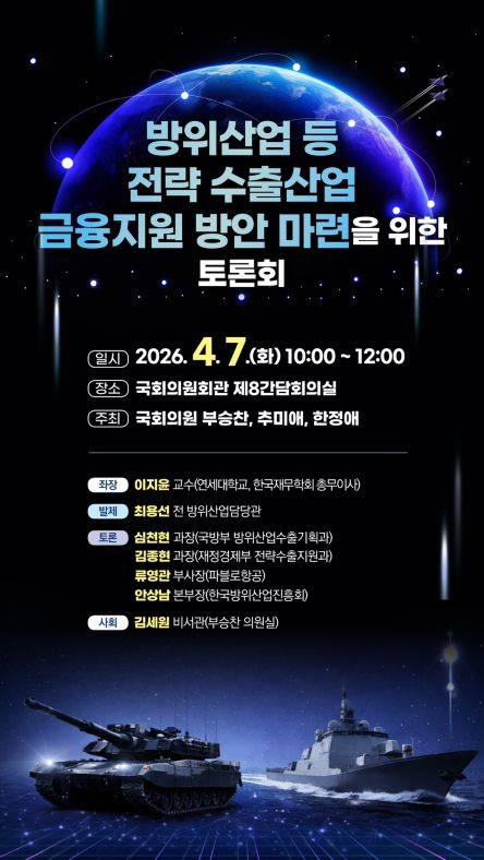 6일 부승찬(더불어민주당, 경기 용인병) 의원실에 따르면 7일 오전 10시 국회의원회관에서 ‘방위산업 등 전략 수출산업 금융지원 방안 마련을 위한 토론회’가 개최된다. 이번 토론회는 국회 국방위원회 간사인 부승찬 의원과 추미애·한정애 의원이 공동 주최한다.