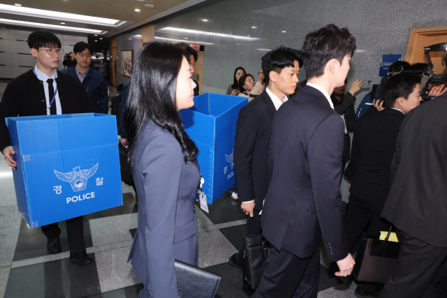 ▲6일 오전 전북경찰청 반부패경제범죄수사대 수사관들이 김관영 도지사의 '금품 살포 의혹'과 관련한 압수수색 영장을 집행하기 위해 전북도청 4층 도지사실로 진입하고 있다. ⓒ연합뉴스