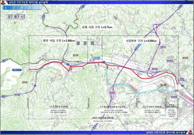 강릉시는 지난해까지 회산교~여전교(4.09㎞) 구간을 우선 개설한데 이어 오는 4월 성산면 구산강변길(0.7㎞) 구간 착공을 시작으로 연내 총 3.58㎞를 완료하여 전체 노선(7.67㎞)을 차질없이 개통할 예정이다.