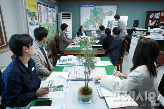 전남 나주시가 나주 역세권(KTX) 복합개발 사업의 본격 추진을 위해 용역 진행상황을 점검하며 복합환승거점 조성에 박차를 가하고 있다.