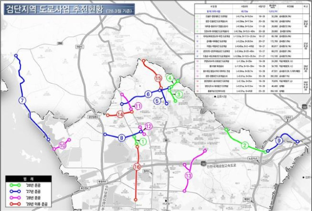 검단지역에서는 검단양촌IC~봉수대로, 금곡동~대곡동 구간 등 총 16개 도로사업이 추진된다. 총연장 40.73km, 사업비는 약 1조 6137억 원 규모다. 올해 4개 사업을 시작으로 내년 5개, 2028년 4개, 이후 3개 사업이 순차적으로 개통될 예정이다.