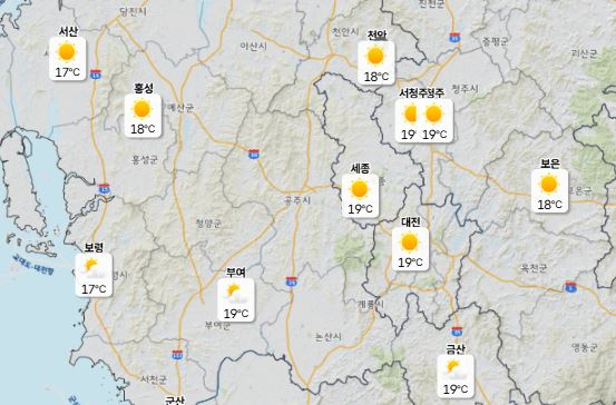 이날 낮 최고기온은 대전·세종·청주 19도, 천안 18도로 예보됐으며 아침 최저기온은 6도에 머물러 13도 안팎의 일교차를 보이겠다.