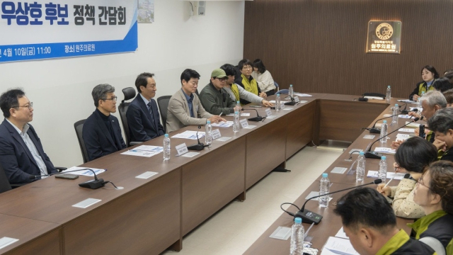 우상호 더불어민주당 강원도지사 후보가 10일 원주의료원 대회의실에서 보건의료노조 강원본부 간담회를 갖고 강원도 내 의료 현안 및 보건의료 노동자들의 권리 보장 방안을 논의했다.