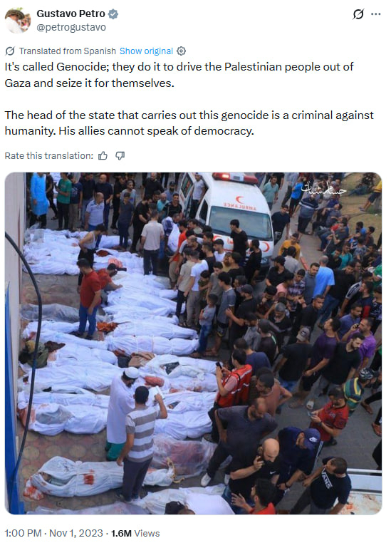 남미에서 가장 활발히 비판 입장을 내는 구스타보 페트로 콜롬비아 대통령은 2023년 11월 자신의 X에 "이것은 대량학살이라 불린다. 이스라엘은 팔레스타인 사람들을 몰아내고 가자지구를 차지하려고 이런 짓을 한다"며 "대량 학살을 자행하는 국가 원수는 반인도적 범죄자다. 그들의 동맹국은 민주주의에 대해 이야기할 자격이 없다"고 글을 썼다.