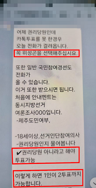 문대림 국회의원 선거사무소는 최근 위성곤 의원 보좌진으로 추정되는 인물이 SNS 단체 대화방에 '1인 2표' 행사를 독려하는 정황이 포착됐다고 13일 밝혔다.