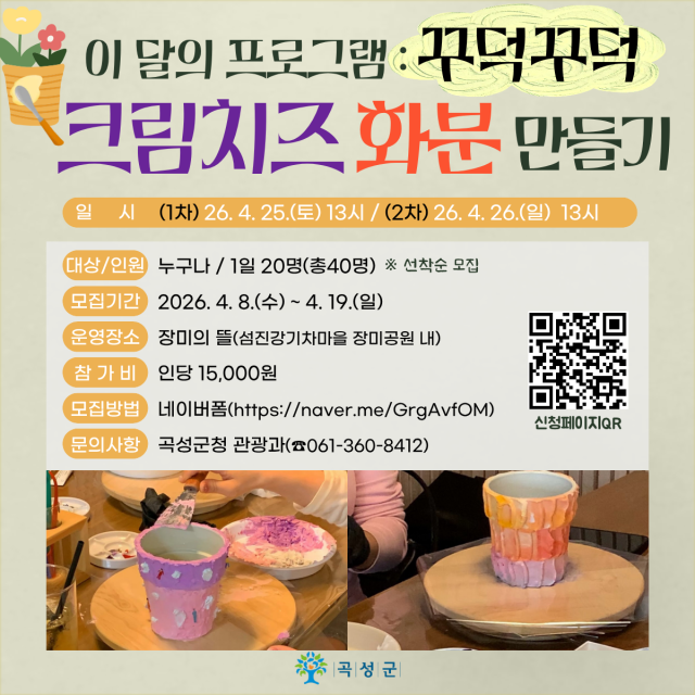 전남 곡성군은 오는 25일부터 26일까지 이틀간 '꾸덕꾸덕 크림치즈 화분 만들기' 프로그램을 운영한다고 13일 밝혔다.