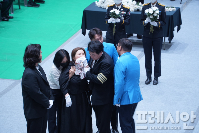 체육센터는 먹구름이 가득한 운구행렬이 식장으로 들어서기도 전부터 정문 인근에서는 "내 새끼, 내 아들 어떡하냐"는 유가족의 절규가 울려 퍼졌다.