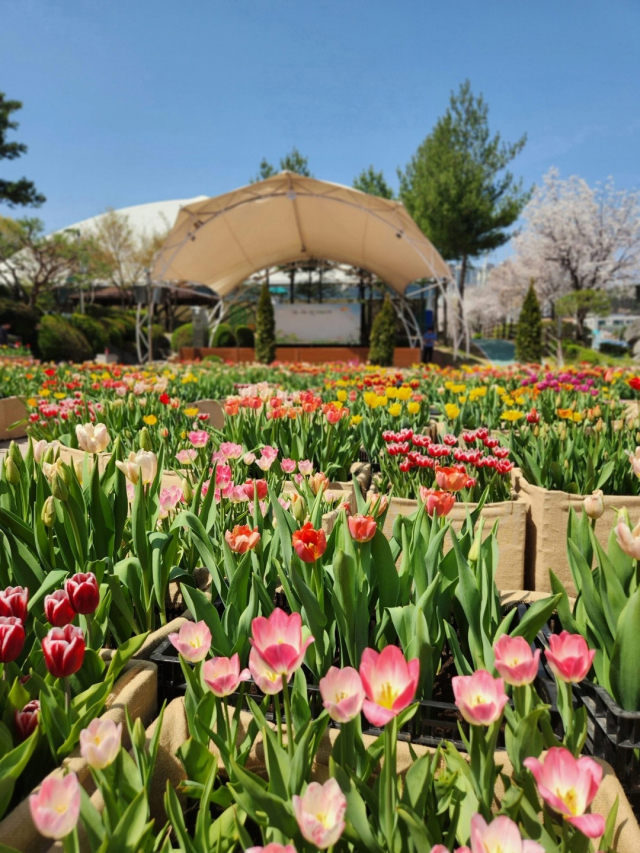14일 시에 따르면 분수광장 일원에 총 1만2000본 규모의 튤립을 활용해 미로형 화단을 조성했다. 이번 화단은 튤립 구근을 상자 식재 방식으로 심은 ‘튤립상자’를 활용해 원형 동선을 따라 걸을 수 있도록 설계된 것이 특징이다.