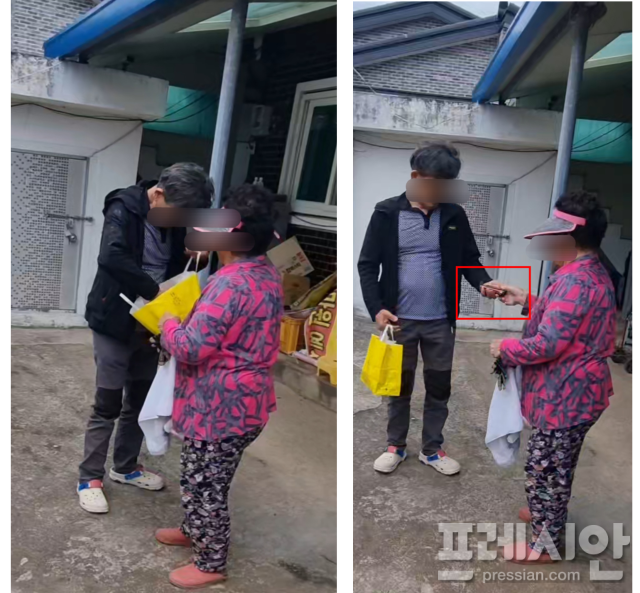 제보된 영상에는 정리1리 이장 B씨가 수십 대의 휴대전화를 담은 노란색 쇼핑봉투를 들고 다니며 휴대전화를 돌려주는 모습이 담겨있다.