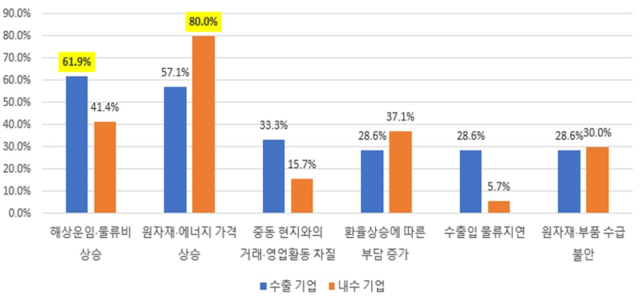 수출 비중 50% 이상의 수출기업은 '해상운임·물류비 상승'(61.9%)을, 내수기업은 '원자재·에너지 가격 상승'(80.0%)을 가장 큰 고충으로 토로해 사업 형태에 따라 어려움의 양상이 다르게 나타났다.