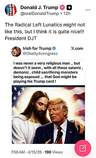 도널드 트럼프 미국 대통령이 교황을 비난하고 스스로를 예수로 표현한 이미지를 SNS에 게재하면서 가톨릭뿐만 아니라 기독교계의 비난에 직면하고 있는 가운데, 이번에는 예수로 추정되는 인물이 본인을 감싸고 있는 그림을 게재했다. 종교를 계속 건드리는 이같은 트럼프 대통령의 행태가 안그래도 이란과 전쟁으로 악화된 여론을 더 증폭시킬 것이라는 전망이 나온다.