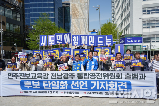 초대 전남광주 통합특별시 교육감 선거에 나선 민주진보 진영의 정성홍·장관호 예비후보가 '원팀'을 선언하며 단일화에 합의했다. 이들은 16일 5·18민주광장에서 '전남광주통합공천위원회' 출범을 알리고 "비리와 불신으로 무너진 교육을 시도민의 힘으로 바로 세우겠다"고 밝혔다.