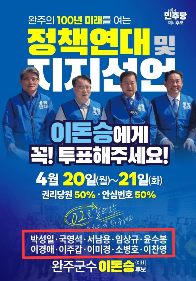 이돈승 후보는 “정책연대가 실제 지지로 과장돼 전달되고 있다”며 “이경애 완주군의원과 이진영·신승기 군의원 예비후보 등도 명단 포함과 관련해 항의한 것으로 알고 있다”고 말했다.