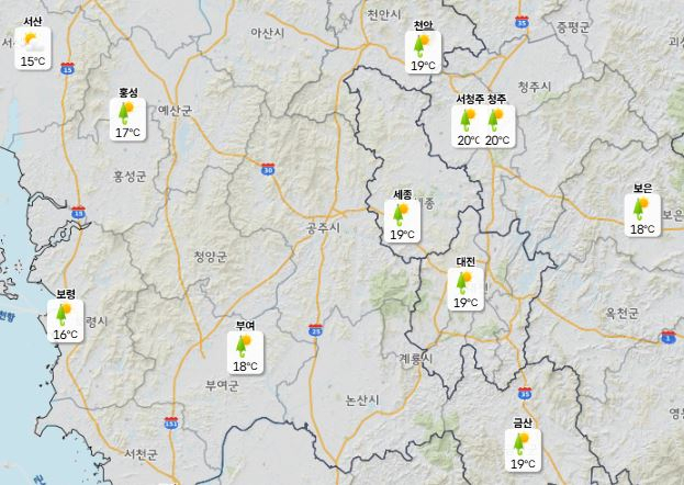 이날 낮 최고기온은 대전·세종·천안 19도, 청주 20도에 머물겠으며 아침 최저기온은 12도 수준으로 비교적 온화한 분포를 보이겠다.