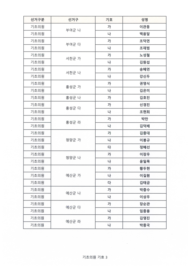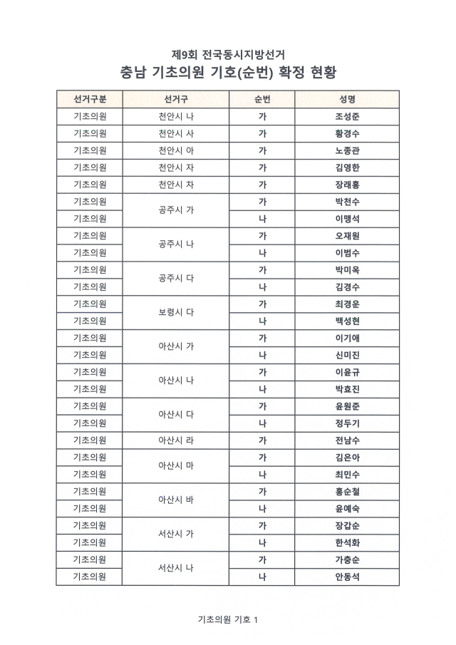 추가 확정에서는 보령지역 일부 선거구 기호가 새로 배정됐다. 보령시 ‘가’ 선거구는 김종호(가)·백남숙(나), ‘나’ 선거구는 김지호(가)·서정호(나), ‘라’ 선거구는 유병호(가)·전진석(나) 후보로 각각 확정됐다.