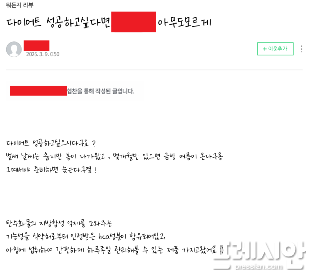 지난 20일 <프레시안>이 확보한 자료에 따르면 해당 블로그에는 2024년 1월 2일부터 2026년 3월 25일까지 작성된 게시글 가운데 협찬 또는 광고 형태로 보이는 글 194건이 정리돼 있으며 협찬 제품을 금액으로 환산하면 총 909만 7021원에 이르는 것으로 나타났다.