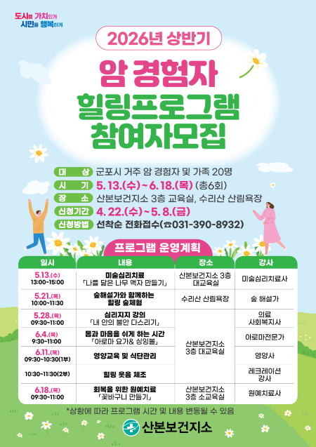 경기 군포시 산본보건지소는 오는 5월 13일부터 6월 18일까지 총 6회에 걸쳐 암 경험자와 가족 20여 명을 대상으로 자조모임 ‘봄·봄·봄 프로그램’을 운영한다고 22일 밝혔다.
