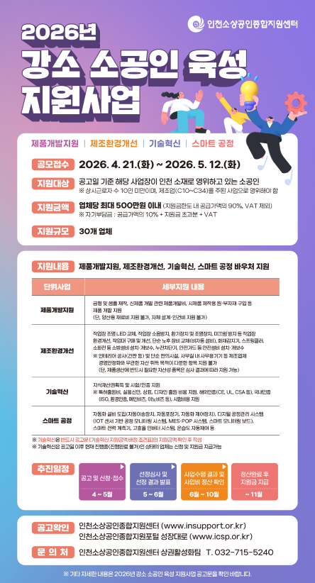 인천광역시는 소공인의 안전하고 쾌적한 근무환경 개선과 안정적인 경영환경 조성을 위해 ‘2026 강소 소공인 육성 지원사업’을 추진한다고 22일 밝혔다.