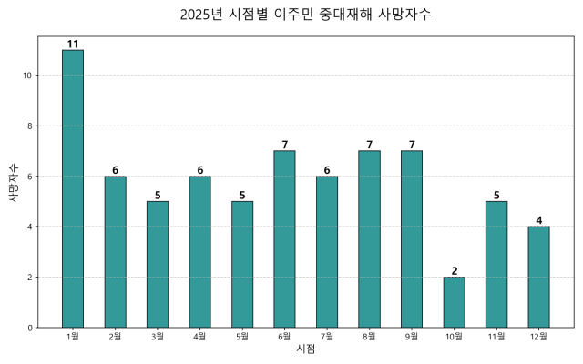 시점별로는 지난해 1월이 11명으로 사망자가 가장 많이 발생했고, 10월이 2명으로 가장 적은 사망자가 보고됐다.