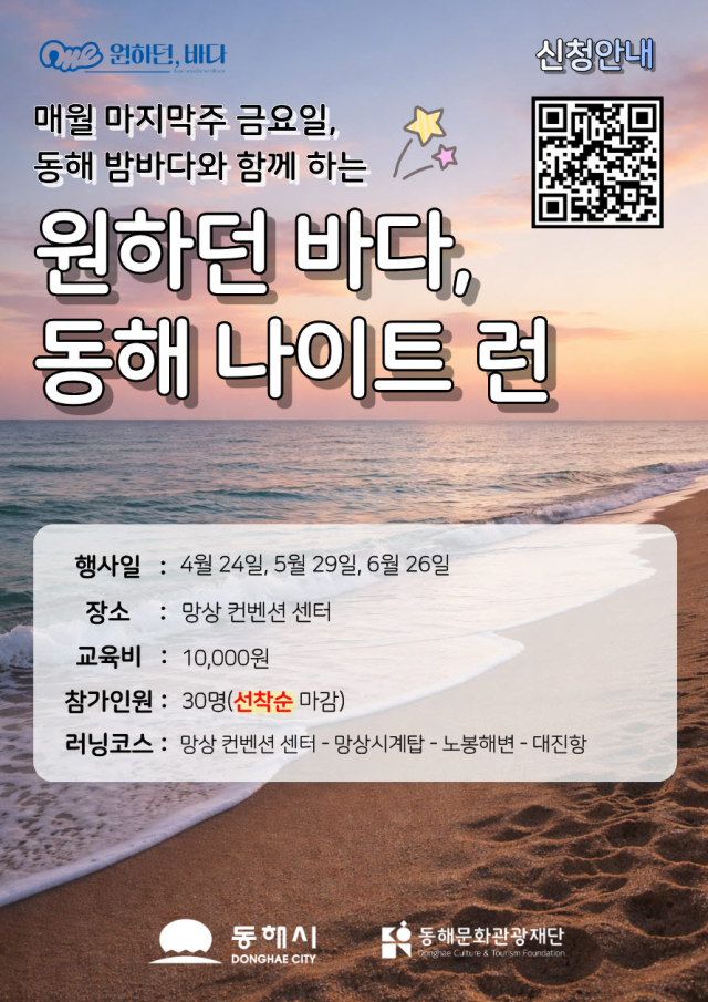 동해문화관광재단은 해양레저스포츠 관광 활성화 공모사업의 일환으로 ‘동해 나이트런’을 4월부터 11월까지 매월 마지막주 금요일 오후 7시 30분부터 9시까지 망상 일원에서 운영한다.