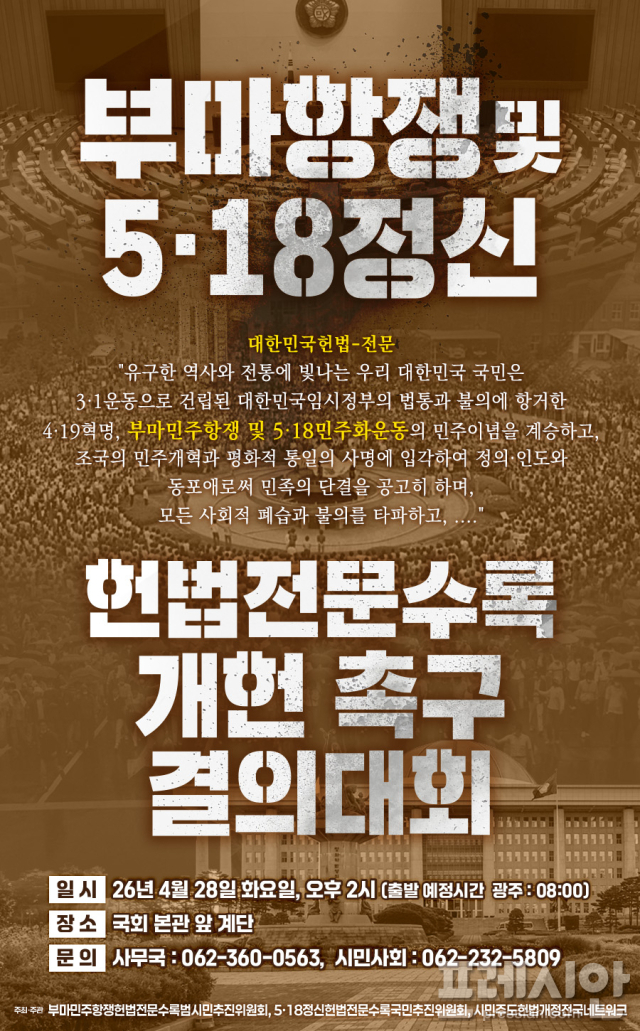 이날 국민결의대회는 5·18정신헌법전문수록국민추진위원회, 부마민주항쟁헌법전문수록범시민추진위원회, 시민주도헌법개정전국네트워크 등 3개 단체가 공동 주최·주관한다.