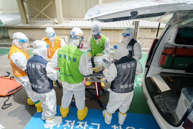 한국수력원자력 월성원자력본부는 23일 원자력발전소 사고에 대비한 월성2호기 방사능방재 전체훈련을 실시했다.