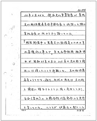 제7차 회담 당시 문화재보호위원회의 사무국장이자 문화재 반환 교섭에도 직접 나섰던 미야치 시게루(宮地茂)는 1964년 3월 24일에 열린 외무성과의 회의에서 다음과 같이 회고했다.