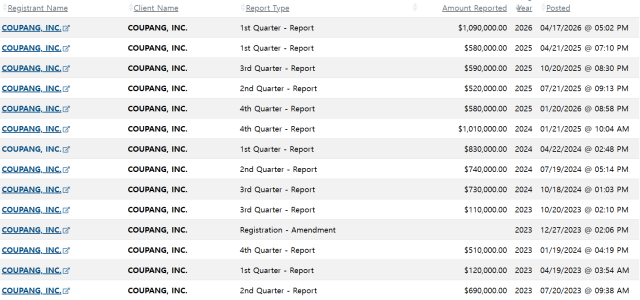 쿠팡은 또 밀러 스트래티지, 발라드 파트너스 등 6개 로비 회사와 계약을 맺고 69만 5000달러를 추가 지출했다.