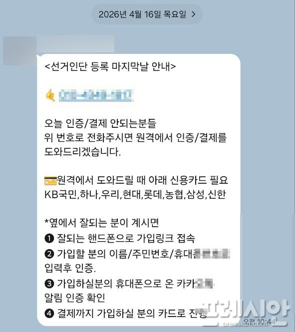 유 후보 측이 제시한 해당 메시지에는 휴대전화 번호와 함께 ‘오늘 인증/결제 안되는 분들 위 번호로 전화 주시면 원격에서 인증/결제를 도와드리겠다’와 ‘다른 사람의 기기로 접속해 가입을 진행하라’ 등의 글과 함께 원격 등록 절차 안내 등의 내용이 담겨 있었다.