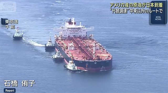 26일 일본 방송 TV아사히는 "이란 정세 악화로 중동에서 원유 수송에 어려움이 가중되는 가운데, 대체 조달처로 미국에서 원유를 실은 유조선이 일본에 도착했다"고 밝혔다. 일본 방송 TBS는 해당 유조선이 도쿄만에 있는 해상 부두에 접안했다고 전했다.
