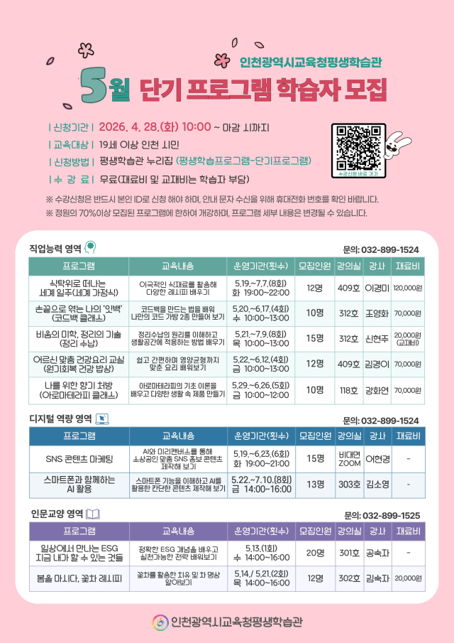 □ 인천광역시교육청평생학습관, ‘5월 단기 평생교육 프로그램’ 학습자 모집