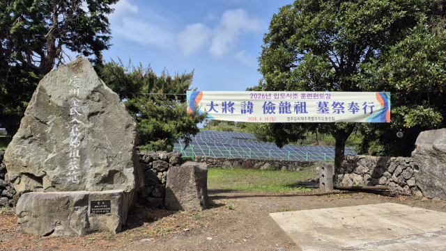 ▲태양광발전이 설치된 경주김씨 제주 입도시조 묘역과 묘제봉행현수막 ⓒ경주김씨제주도종친회
