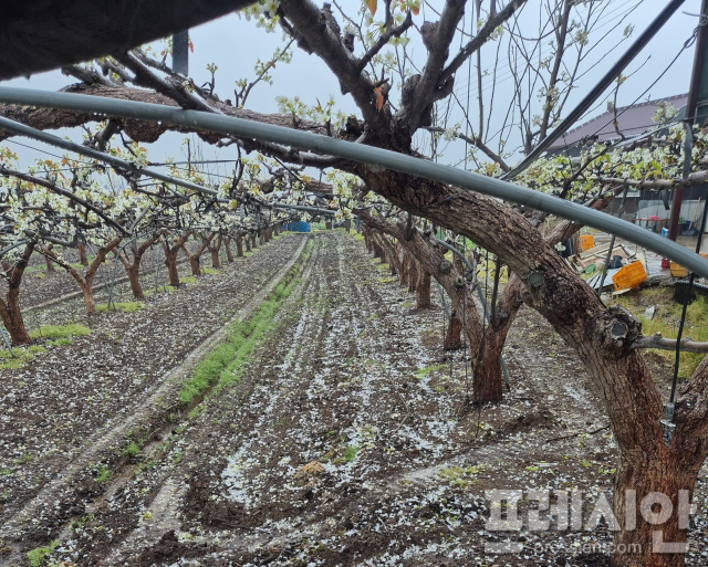 배꽃 수정시기는 수확량과 품질을 좌우하는 중요한 단계로, 일부 농가가 이미 수정작업을 시작한 가운데 갑작스런 우박으로 인한 피해가 발생해 농민들의 시름이 깊어졌다.