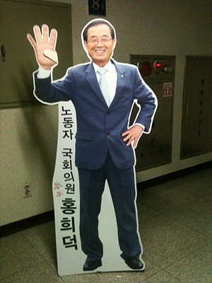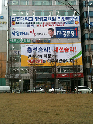 야권단일후보인 홍희덕 후보의 캠프는 사우나 건물에 딸린 주차장 한 켠에 있었다. 주차장 8층 한 구석, 자동차를 위한 공간이었던 그 자리에 홍희덕 후보는 나무로 골대를 마련하고 비닐로 벽을 만들었다. 출판기념회 때 썼던 대형 현수막을 '재활용'했다.