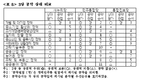보고서는 새누리당의 공약과 관련해 "과거 한나라당과 비교했을 때 한 단계 발전한 것"이라고 평하면서도 "민주통합당은 새누리당에 비해 보다 근본적인 변화를 모색하고 있는 것으로 평가된다"고 지적했다. 다만 민주통합당의 공약에 대해서는 "어느 정도 실효성이 있을지에 대해서는 의문이 간다"고 평했다. 보고서는 "통합진보당은 중소기업 분야에 대한 고민이 나타나지 않고 있다는 점에서 매우 의외로 평가된다"고 밝혔다.