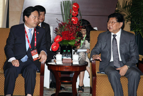 | ▲ 김두관 경남지사가 22일 베이징 시내 호텔에서 열린 제5회 중국국제다국적기업촉진회 참석에 앞서 쩡완통(鄭萬通) 정협부주석 겸 중국 다국적기업촉진회장과 환담하고 있다. ⓒ연합뉴스 |