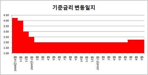 그간 한은은 정부가 위기 탈출을 위해 추진하던 재정적자+유동성공급 기조에 힘을 실어주기 위해 작년 2월부터 지난 6월까지 16개월간 기준금리 2.00%를 유지했다. 이후 지나치게 풀린 유동성이 국내 경제에 새 위협요인으로 꼽히자 한은은 7월 금통위에서 기준금리를 0.25%포인트 올렸다. 연내 추가 인상이 있으리라는 전망이 당시 시장에 우세했다.