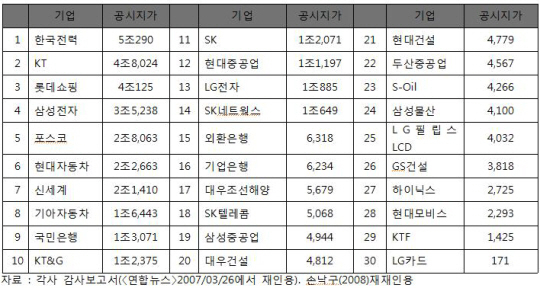 〈표 5〉30대 대기업이 보유한 토지가격(2006년) 단위 : 억원