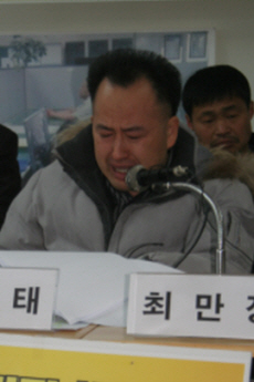 | ▲ 삼성전자 해고자 박종태 씨가 지난 27일 해고무효소송을 알리는 기자 회견에서 울음을 터트렸다. 박 씨의 사연은 트위터 등 소셜 미디어를 통해 빠르게 알려졌다..ⓒ프레시안(김윤나영) |