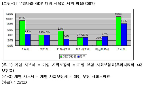 OECD 통계자료에 비추어 보면 우리나라가 우선적으로 증세를 추진해야 하는 부분은 소득세, 기업부담 사회보장세 부분이다. 2007년 우리나라 GDP 대비 소득세 비율은 4.4% 였지만, OECD 평균이 9.4%였다. 같은 해 우리나라 기업부담 사회보장세 비율 또한 2.4%에 불과했지만 OECD 평균은 5.4%였다.